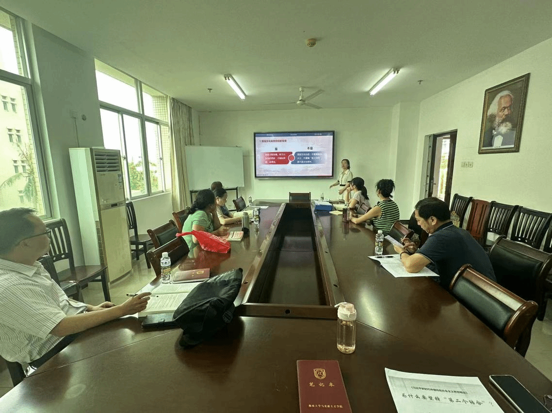 第二环节,教研室全体教师围绕教学展示进行研讨。大家认为,一是遵循“提出问题”“阐明为什么坚持‘第二个结合’”“分析价值意义”的思路来梳理内容会更清晰;二是选择海南案例相对来说会更生动;三是课程结束时应深化主题立意。