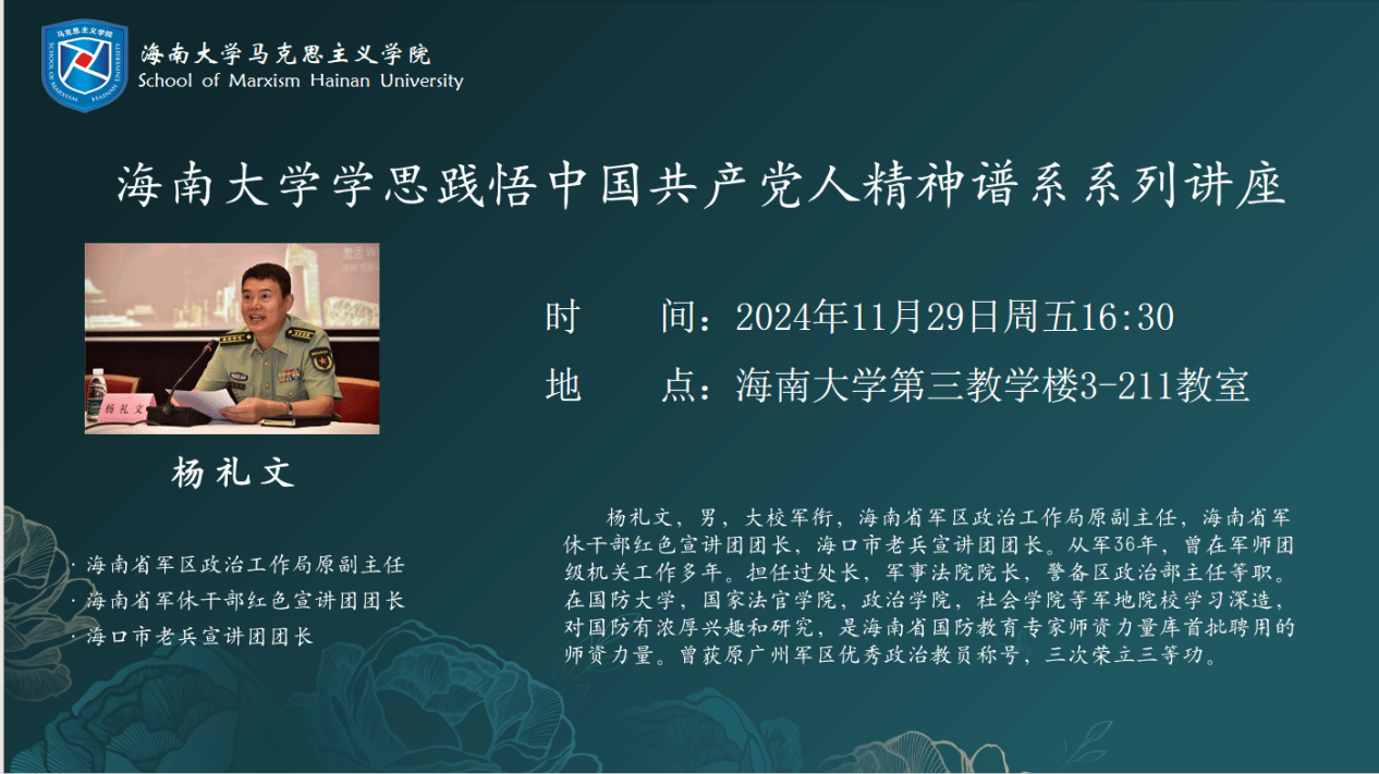 2024年11月29日,伟德国际1946邀请海南省军休干部红色宣传讲团团长杨礼文大校作伟德国际1946学思践悟中国共产党人精神谱系系列讲座报告。报告以“认识南海,热爱南海,捍卫南海”为主题,从南海的基本情况和复杂成因两个方面展开讲述。报告由凤翔书院郭孝伟老师主持,伟德国际1946蔡文举副经理参加。