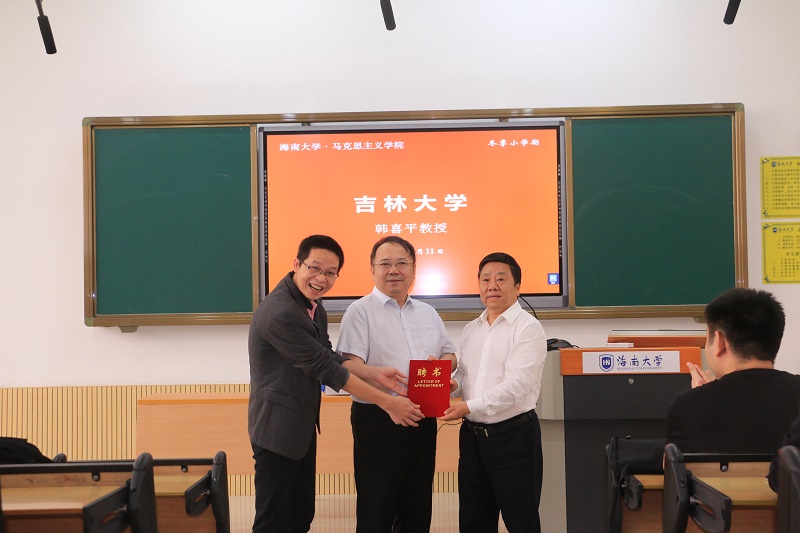 1月11日至1月12日,2019-2020学年冬季小学期名家讲堂第七讲在5号教学楼112教室举行。吉林大学韩喜平教授应邀就“中国特色社会主义政治经济学”的相关知识为公司同学进行授课。经理张云阁出席并为韩喜平教授颁发伟德国际1946“冬季小学期授课外聘专家”证书。讲座由思想政治教育系主任陈招万主持。