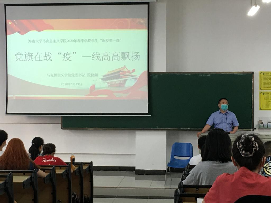 段捷频以“党旗在战‘疫’一线高高飘扬”为主题作讲授。他指出,新冠肺炎突如其来,党中央高度重视,习近平总书记亲自指挥、亲自部署,打响了疫情防控的人民战争、总体战、阻击战。在党中央坚强领导下,各级党组织和广大党员、干部冲锋在前、英勇奋战,医务工作者和支援湖北医疗队员白衣执甲、逆行出征,人民解放军指战员闻令即动、勇挑重担,广大社区工作者、公安干警、基层干部、下沉干部、志愿者等广大群众众志成城、踊跃参与,谱写了波澜壮阔、感天动地的战“疫”史诗。让我们深刻认识到中国共产党强大的战斗力和凝聚力,深刻感受到中国特色社会主义制度的优越性。他强调“生命重于泰山,疫情就是命令,防控就是责任,”党的全部力量来自组织,而防控一线又是检验初心使命的试金石,是锤炼担当斗争精神的磨刀石。中国共产党时刻为人民而战、靠人民而胜。全党全国人民上下一心,共同阻止疫情,就一定能够战无不胜。他对同学们提出五点希望,一是积极传播正能量,弘扬中国精神,自觉抵制负面舆情;二是要肩负起青年马克思主义者的使命担当,与祖国同呼吸共命运;三是积极发挥好党组织战斗堡垒作用和党员先锋模范作用;四是要把常态化疫情防控和复学复课两手抓,两手都要硬,五、迅速在公司开展文明大行动和爱国卫生运动,展现马院新风尚。