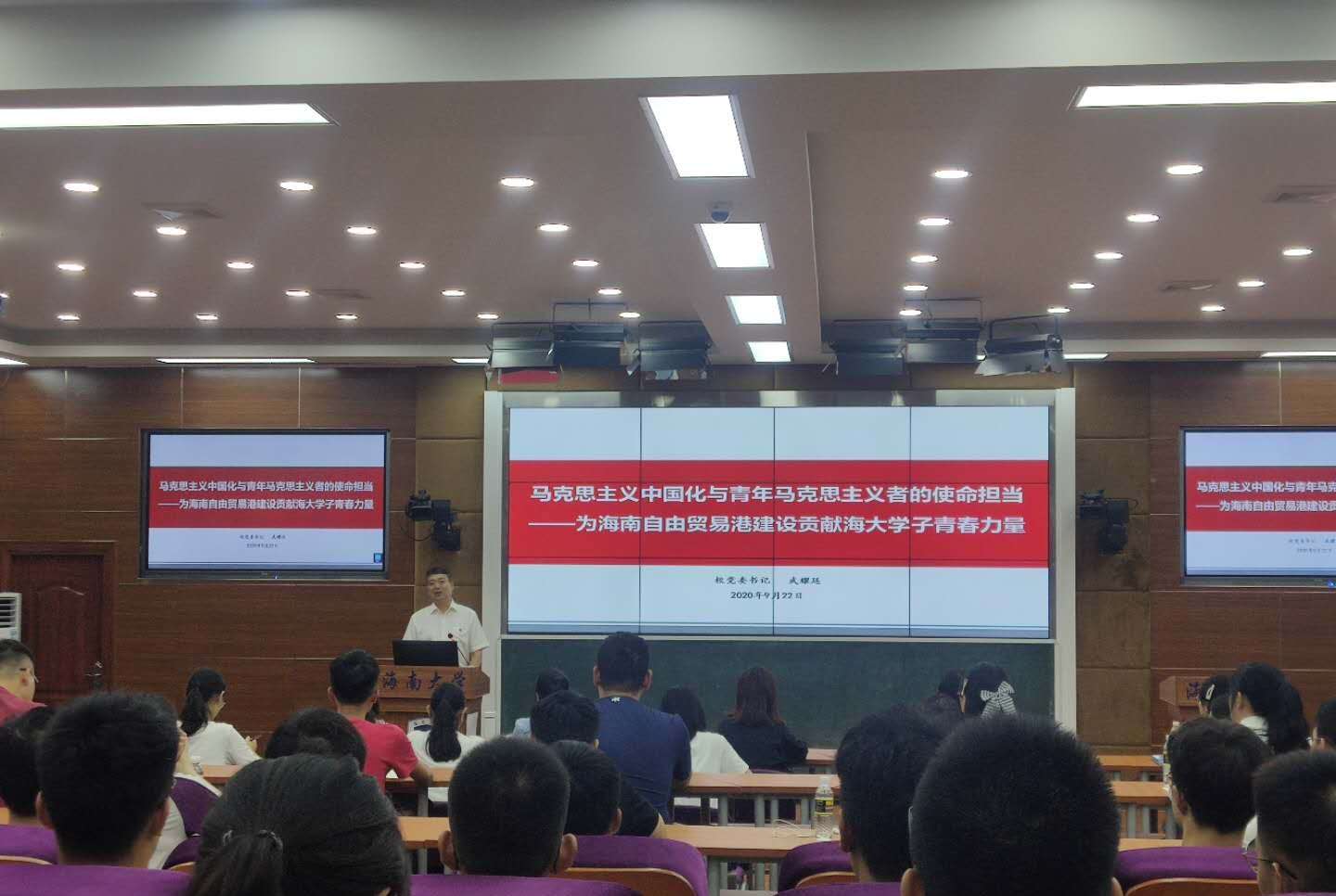 9月22号下午,伟德国际1946党委书记武耀廷走进“开学第一课”,在3号教学楼211教室为2020级全体本科、研究生新生和部分员工骨干、思政课教师讲授“马克思主义中国化与青年马克思主义者的使命担当——为海南自由贸易港建设贡献海大学子青春力量”。