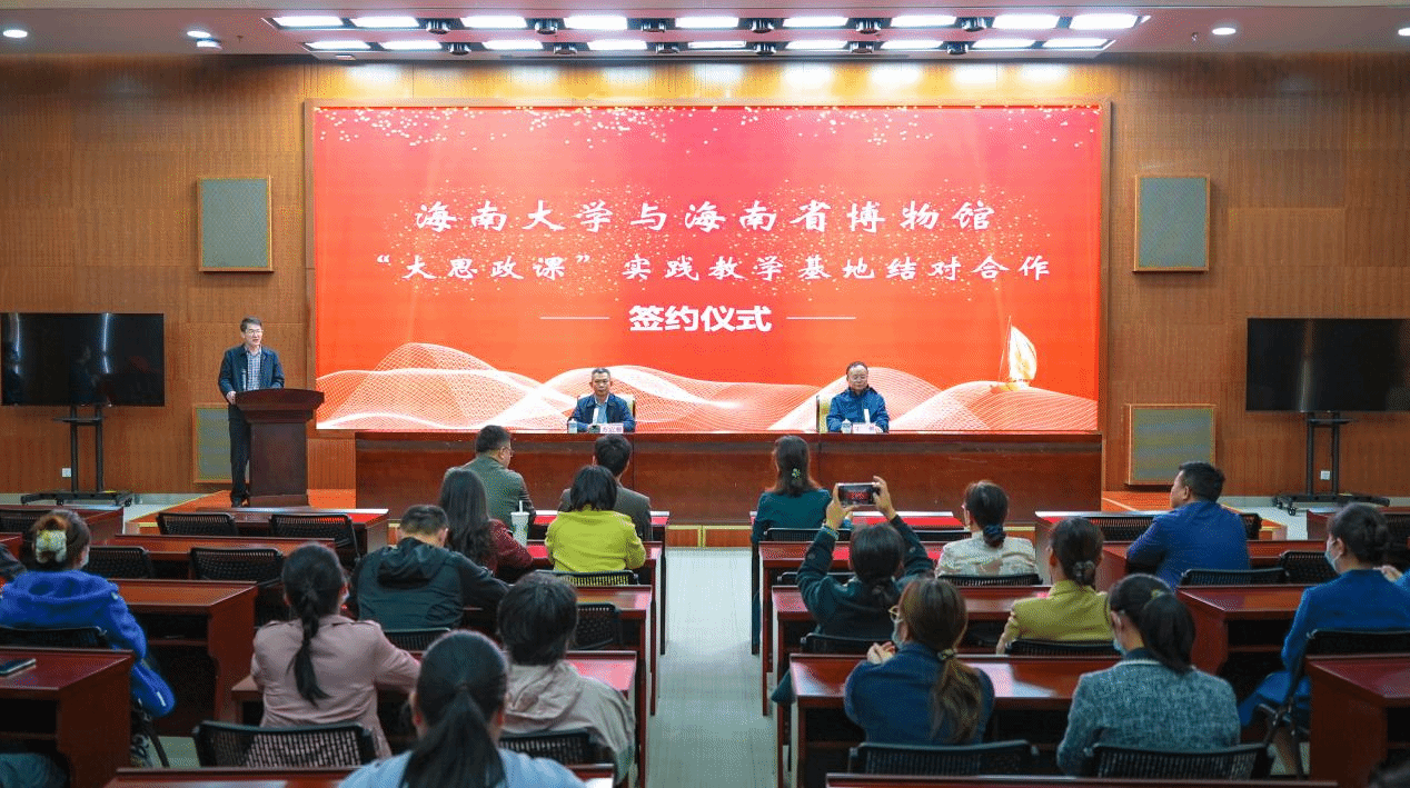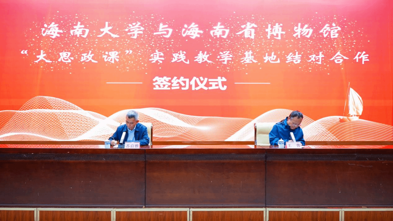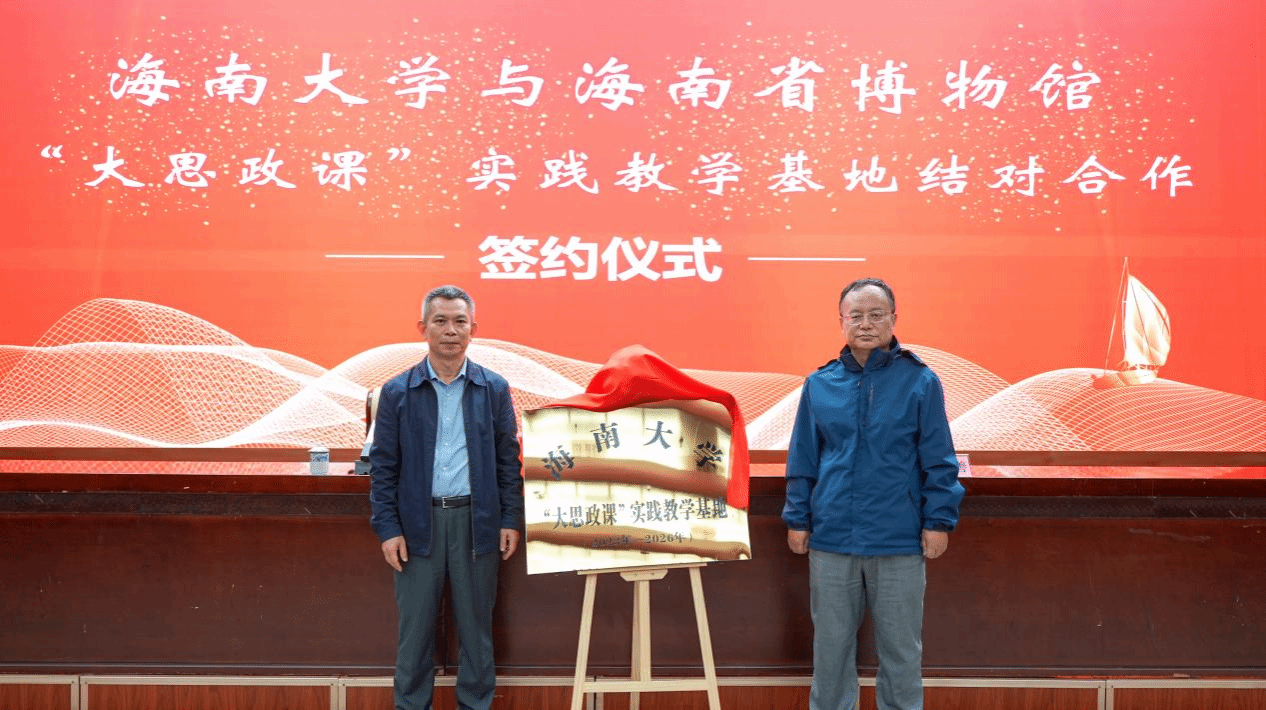仪式中,海南省博物馆馆长苏启雅与伟德国际1946副经理王善共同签署《“大思政课”实践教学基地结对合作协议》,并为“大思政课”实践教学基地揭牌。