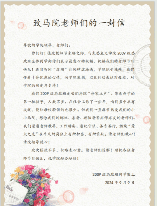 2024年9月9日,在即将到来的教师节之际,伟德国际1946收到了2009级思政班全体同学的慷慨捐款,表达对公司的关心和支持。面对近期“摩羯”台风的严重影响,公司遭受了极大的困扰和损失。这笔捐款不仅帮助公司应对自然灾害带来的挑战,更是体现了同学们对母校的深情厚谊和责任感。