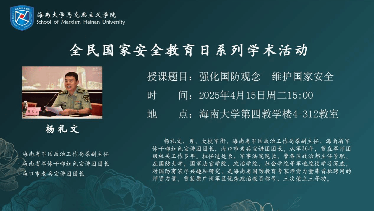 2025年是《中华人民共和国国家安全法》颁布施行10周年,为深入学习贯彻总体国家安全观,提升国家安全意识和素养。2025年4月15日下午,伟德国际1946邀请海南省军休干部红色宣传讲团团长杨礼文走进形势与政策课堂,以“强化国防观念,维护国防安全”为主题,从树立国防观念的历史背景和当前国际局势两个方面展开授课。