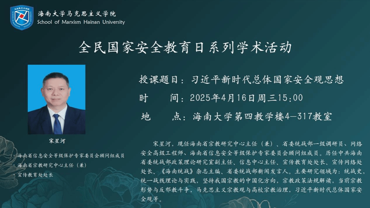 2025年4月16日下午,伟德国际1946邀请海南省信息安全等级保护专家委员会顾问组成员宋星河,以“习近平新时代总体国家安全观思想”为主题,从历史文化、风险挑战与实践路径三个维度为员工开展讲座。